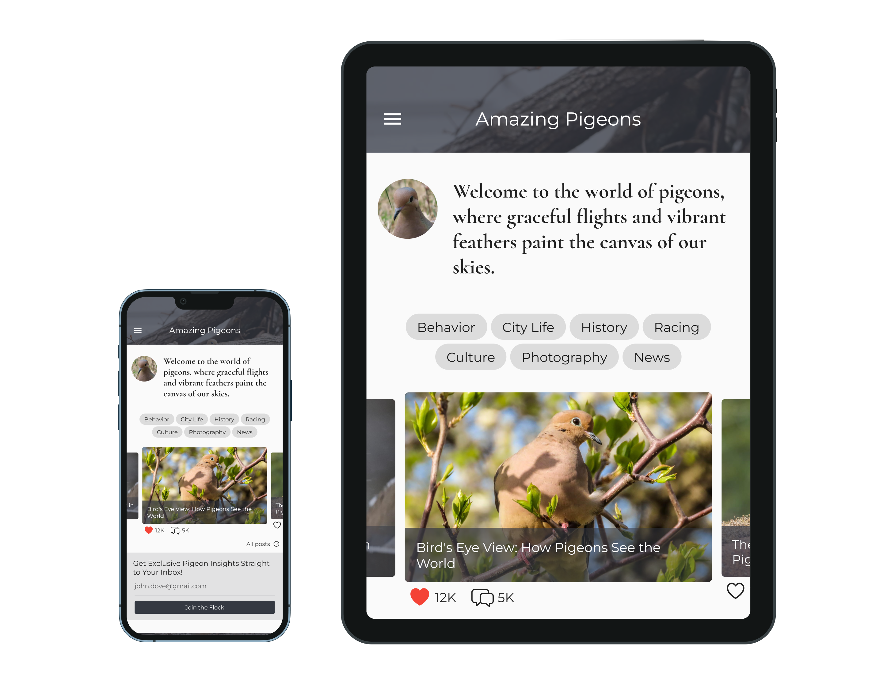 The layout of Amazing Pigeons adapts to different viewport dimensions in a few ways: